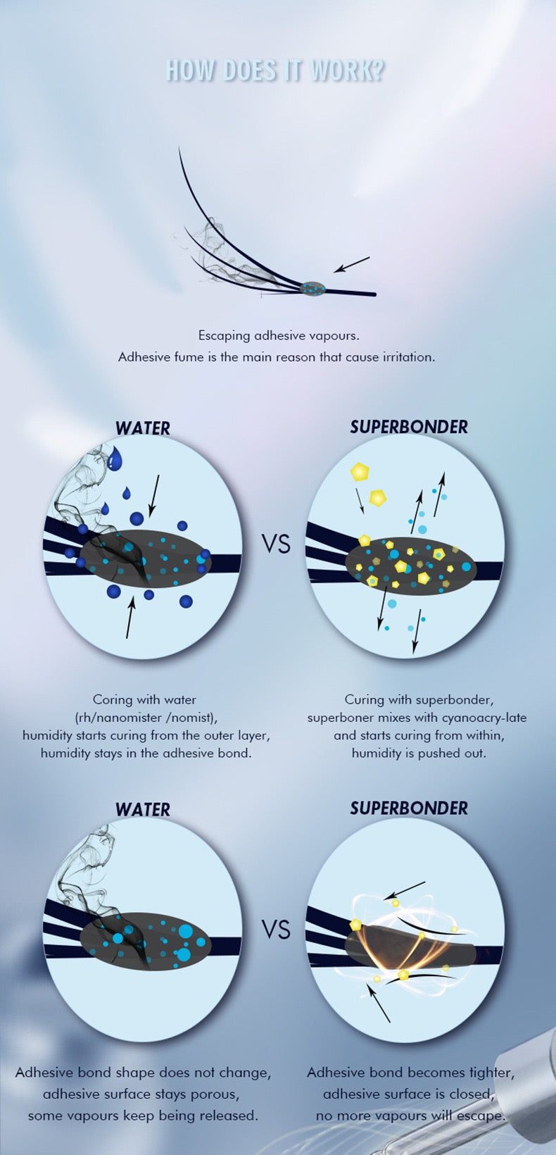 Super Bonder is an amazing product that help ANY lash glue cure fast and increase your retention by 30%. Apply it where the adhesive is bonded to the natural lashes and the bonder cures from the outside to the inside of the bond.